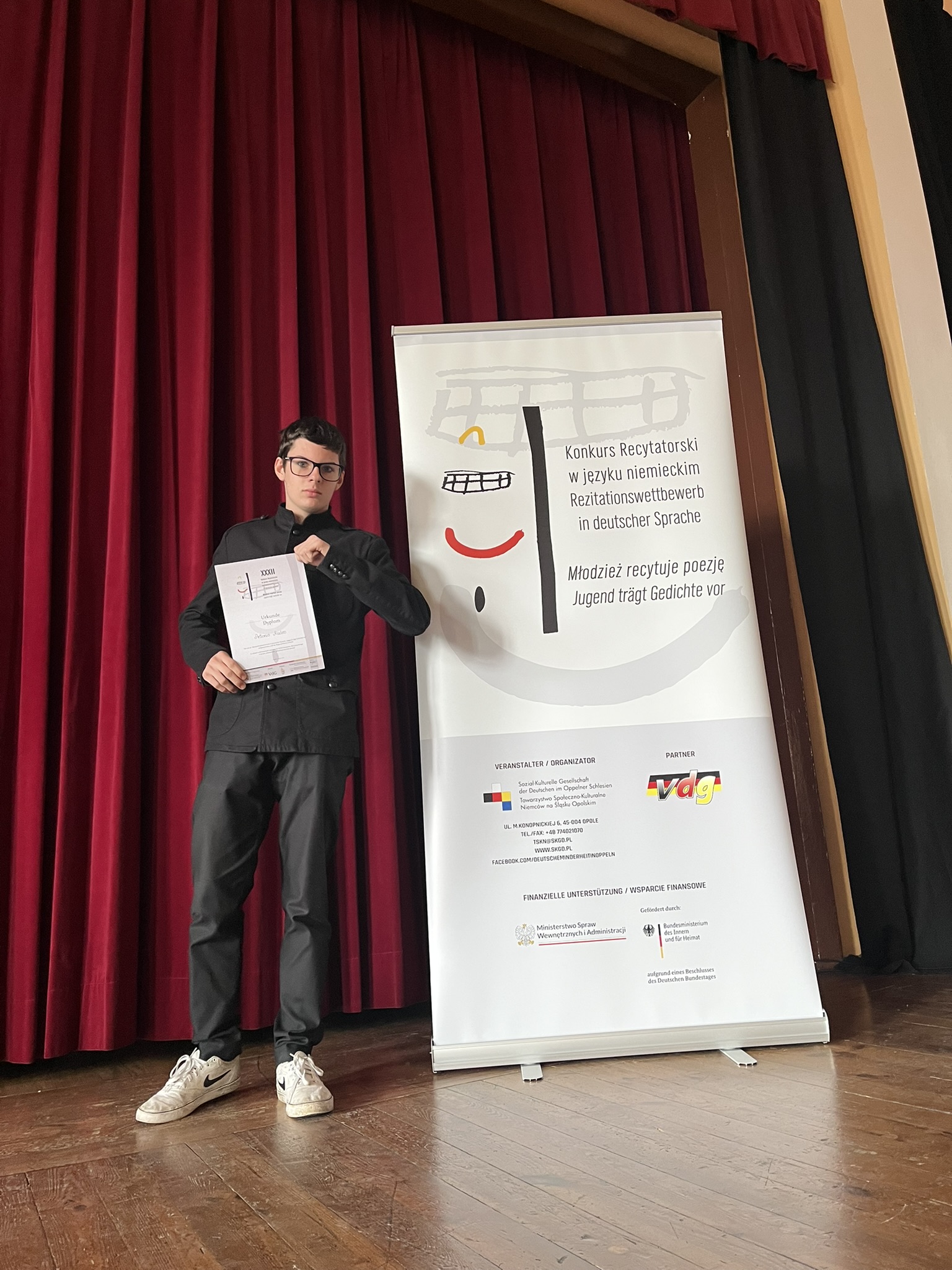 14 kwietnia odbył się w Oleśnie rejonowy etap konkursu recytatorskiego w języku niemieckim „Jugend trägt Gedichte vor” („Młodzież recytuje poezję”), w którym wziął udział nasz uczeń kl. 1 LO Antonio Madeo, przygotowywany przez nauczycielkę j. niemieckiego Beatę Sikorę. Antonio wyrecytował wiersz w języku niemieckim Kurta Tucholsky’ego „Mikrokosmos” zajmując 3 miejsce w kategorii szkół ponadpodstawowych i zakwalifikował się do finału konkursu, który odbędzie się w czerwcu. Gratulujemy Antonio i życzymy powodzenia w finale!  Trzymamy kciuki!!!