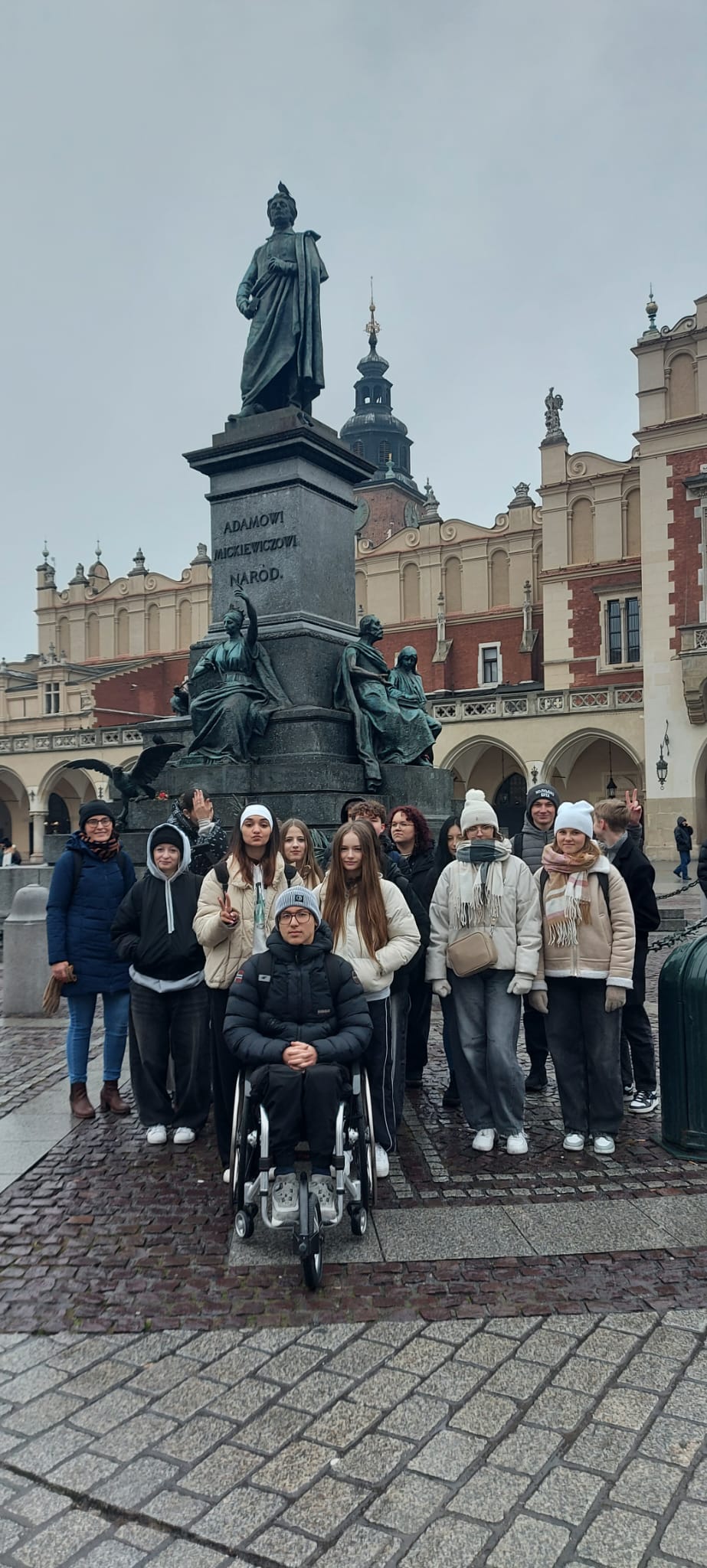 W dniu 12 grudnia 2024r. klasa 3a LO wybrała się pociągiem na przedświąteczną wycieczkę do Krakowa. Planowo dotarliśmy na miejsce, a później spacerując uliczkami w stronę krakowskiego Rynku mogliśmy zobaczyć zabytkową zabudowę Krakowa. Przypomnieliśmy sobie najważniejsze informacje o pięknych obiektach w obrębie Starego Miasta. Tutaj uczniowie mieli okazję wcielić się w rolę przewodników wycieczki opowiadając o Bramie Floriańskiej, Kościele Mariackim, Sukiennicach, Pomniku Adama Mickiewicza, Smoku Wawelskim czy Katedrze na Wawelu. Później udaliśmy się na Jarmark Bożonarodzeniowy, aby poczuć jeszcze bardziej świąteczną atmosferę. Szczęśliwi, w sympatycznej atmosferze wróciliśmy do domu.