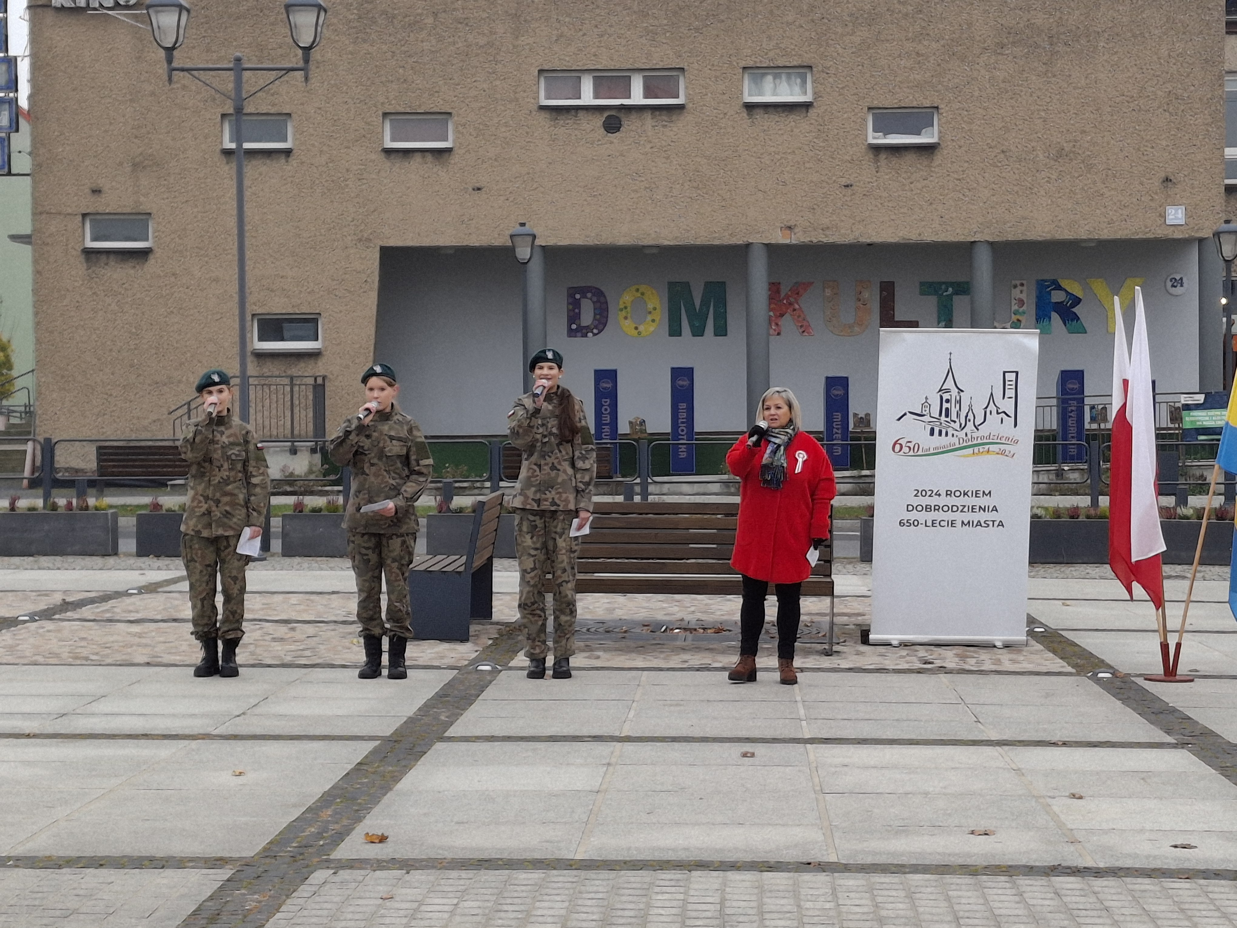 Obchody Narodowego Święta Niepodległości na Rynku Dobrodzienia - o godz. 12.00 uroczyste podniesienie flagi na maszt oraz wspólne odśpiewanie hymnu narodowego i pieśni patriotycznych w wykonaniu uczniów Zespołu Szkół w Dobrodzieniu i mieszkańców gminy Dobrodzień, którzy wspólnie z władzami miasta świętowali kolejną rocznicę odzyskania niepodległości.