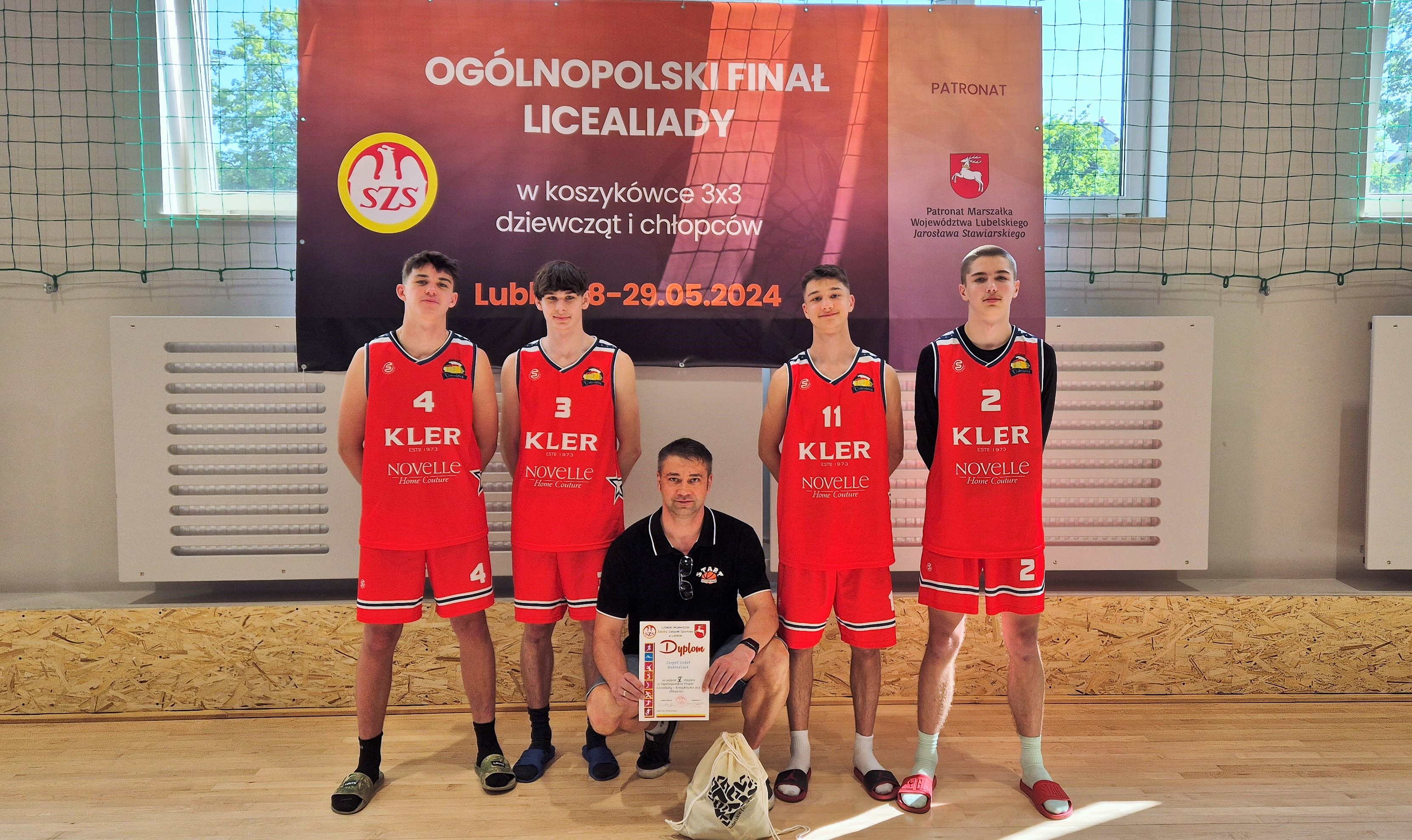 Nasza szkolna reprezentacja koszykarzy odniosła ogromny sukces na odbywających się w dniach 28-29 maja w Lublinie Ogólnopolskich Finałach LICEALIADY w koszykówce 3x3 chłopców! Szkołę reprezentowali młodzi uczniowie, głównie z rocznika 2008, którzy sprawili rewelacyjną niespodziankę zajmując tak wysokie miejsce w kraju. Dla naszej szkoły zagrali - Filip Kotlewski i Michał Sikora (obaj 1 LO), Łukasz Macioł (2 BS) i Jakub Tomaszewski (2 LO). Opiekunem był nauczyciel Tomasz Sikora. Wszyscy na co dzień są wychowankami dobrodzieńskiego klubu START MEBLE Dobrodzień. Co ciekawe - na tej imprezie byliśmy chyba najniższą wzrostem drużyną turnieju, ale za to szybką, zdecydowaną i z wielkim sercem do gry!