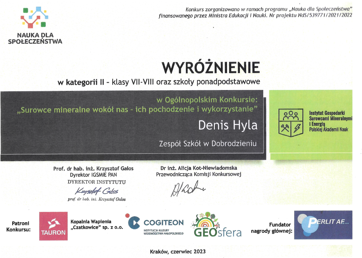 Uczeń klasy 1b LO Denis Hyla wyróżniony w ogólnopolskim konkursie pt. “Surowce mineralne wokół nas – ich pochodzenie i wykorzystanie”, którego organizatorem był Instytut Gospodarki Surowcami Mineralnymi i Energią Polskiej Akademii Nauk w Krakowie.