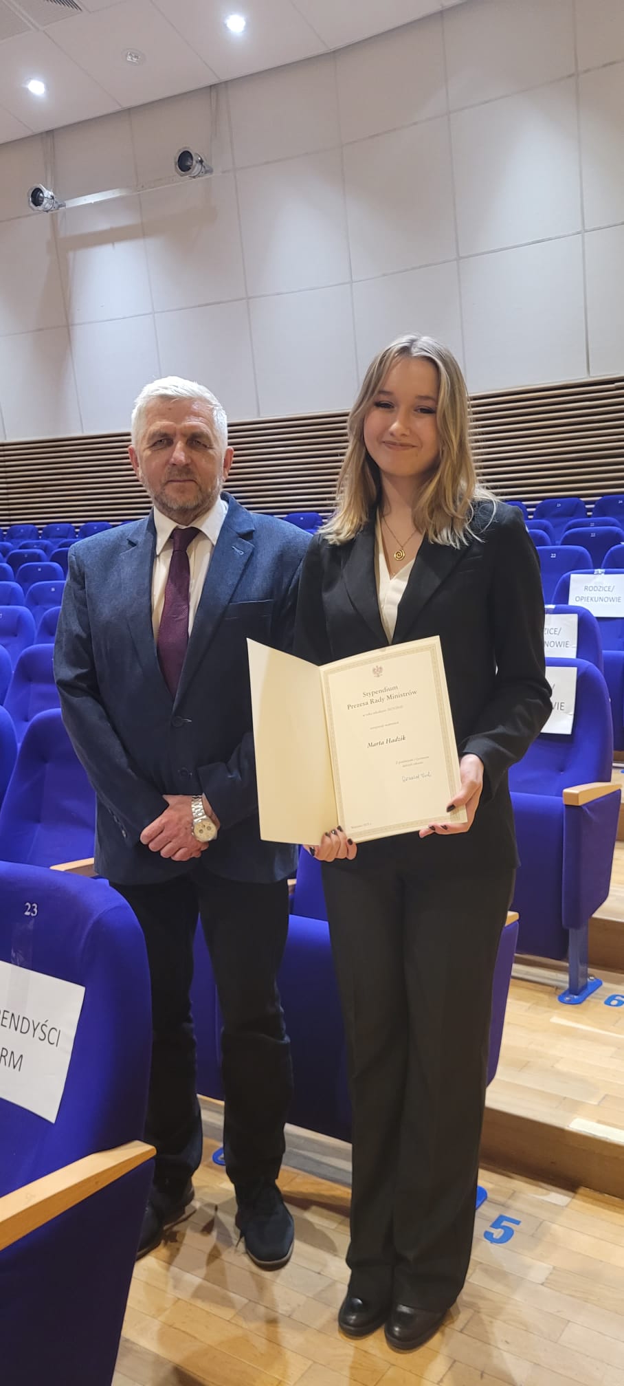 Uczennica klasy 3 LO, Marta Hadzik jest Stypendystką Prezesa Rady Ministrów. Najlepsza uczennica naszego Liceum w roku szkolnym 2024/2025 otrzymała to zaszczytne wyróżnienie z rąk wojewody opolskiej, Moniki Jurek, Opolskiej Kurator Oświaty Joanny Raźniewskiej oraz Opolskiego Wicekuratora Oświaty Marka Leśniaka.