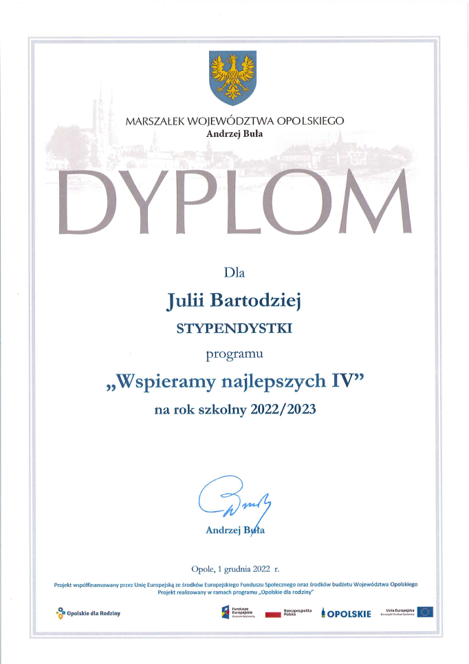 Uczniowie klasy 3 Liceum Ogólnokształcącego, Julia Bartodziej i Roch Przybyliński, zostali stypendystami programu "Wspieramy najlepszych IV" Opolskiego Urzędu Marszałkowskiego na rok szkolny 2022/2023.