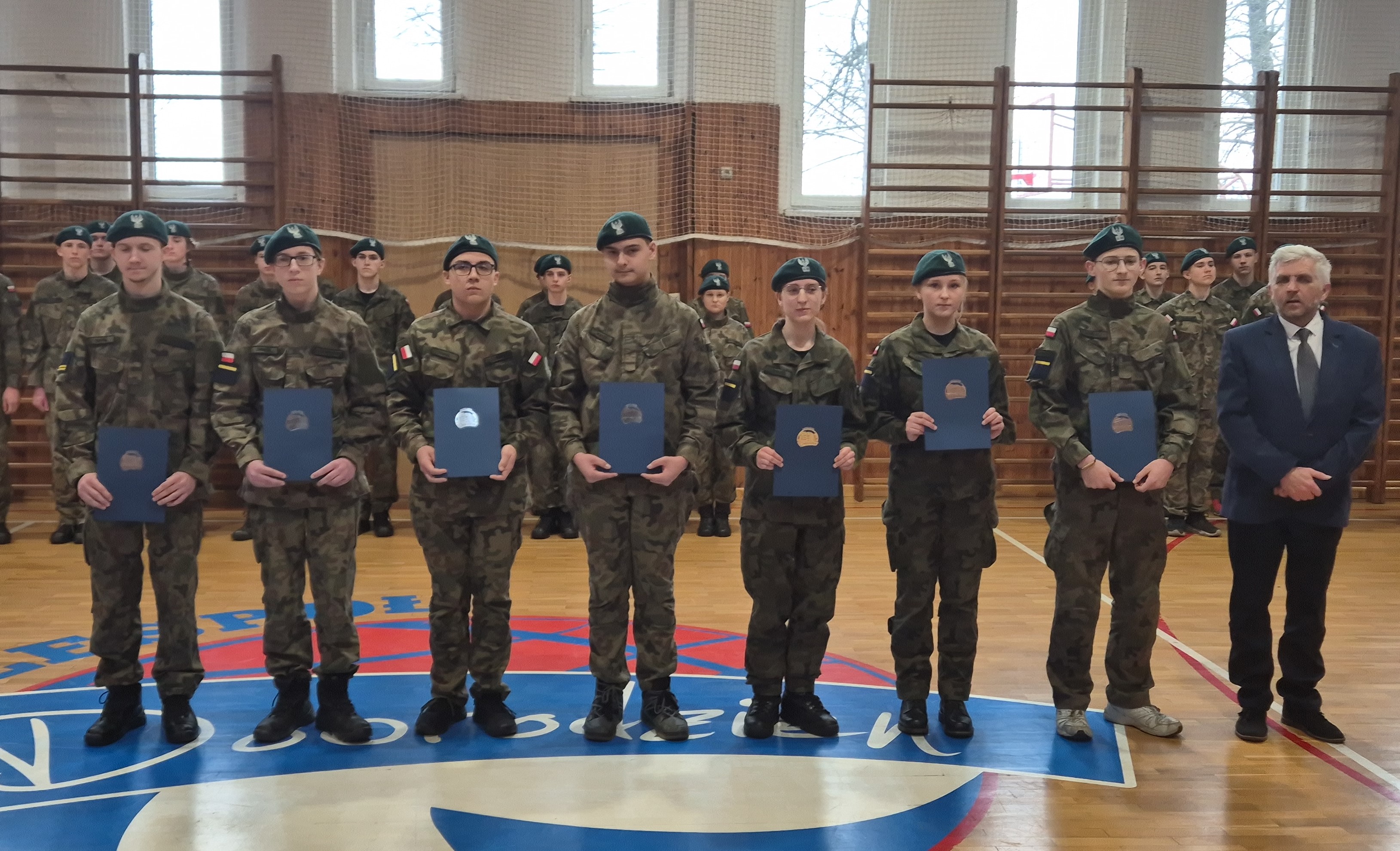 W czwartek, 27 marca po raz drugi w historii naszej szkoły odbyła się uroczystość nadania wyższych stopni awansu kadeta. Ceremonię, którą poprowadził koordynator klas mundurowych Tomasz Sikora, rozpoczął przemarsz z prezentacją klas 1, 2 i 3 b LO. Po wejściu pocztu sztandarowego Liceum wspólnie odśpiewano hymn narodowy. Dyrektor Joachim Wloczyk przypomniał regulamin i znaczenie awansu na wyższe stopnie oraz wyczytał wszystkich nagrodzonych awansem kadetów. Po czym wraz z wychowawcami klas mundurowych dyrektor przystąpił do wręczenia aktów mianowania i przekazał dystynkcję kadeta na mundur. Kadetów nagrodzono brawami.