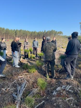 Po dotarciu na leśną polanę i krótkim instruktażu stanowiskowym, uczniowie zostali dobrani w pary, wyposażeni w szpadle i sadzonki sosny. Na hasło dane przez pana leśniczego, ochoczo ruszyli do pracy. Młodzież sadziła nowe sosny. Praca nie była łatwa, ponieważ było dużo korzeni i innych utrudnień, ale uczniowie wyjątkowo szybko obsadzili przeznaczoną dla nich powierzchnię.