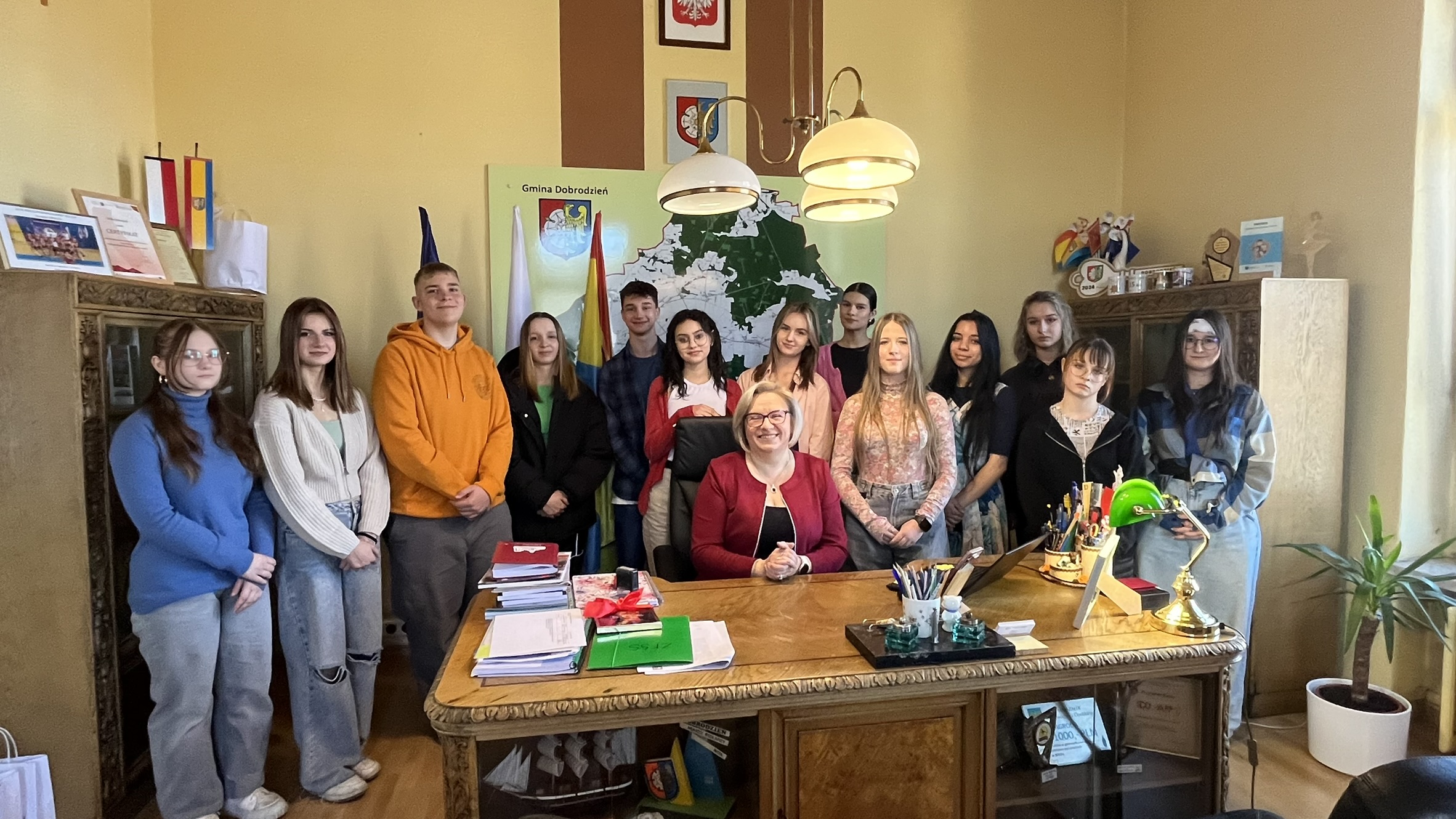 20 marca grupa artystyczna naszej szkoły wraz z opiekunką p. Beatą Sikorą gościła w Urzędzie Miasta i Gminy Dobrodzień na zaproszenie Pani Burmistrz Agnieszki Hurnik. Zaproszenie to było nagrodą za włączenie się w obchody jubileuszu 650-lecia Dobrodzienia i wykonanie pięknego przedstawienia jasełkowego połączonego z jubileuszem miasta. Jak się okazuje, talent sceniczny otwiera nie tylko serca, ale i drzwi gabinetów! Uczniowie mieli okazję porozmawiać z Panią Burmistrz na różne tematy związane z działalnością miasta i gminy. Spotkanie miało również charakter edukacyjny - dowiedzieliśmy się, z jakimi sprawami udamy się w przyszłości do urzędu i gdzie możemy je załatwić – czyli gdzie uderzyć, gdy życie rzuci nam pod nogi biurokratyczne wyzwania. Ciekawą częścią spotkania było "zwiedzenie" urzędu - rozpoczynając od gabinetu pana Wiceburmistrza i pani Burmistrz, gdzie każdy mógł zasiąść przy biurku w fotelu pani Burmistrz (możemy potwierdzić – wygodne!), poprzez poszczególne działy urzędu m. in. wizyta w sali ślubów, gdzie uczniowie mogli wczuć się w role nowożeńców i świadków (choć bez przysięgi i obrączek), czy wizyta w gabinecie pana Sekretarza, pani Skarbnik, w dziale promocji miasta i wielu innych. Spotkanie było bardzo ciekawe i pełne wrażeń. Dziękujemy serdecznie pani Burmistrz za zaproszenie, za edukację i poświęcenie czasu oraz za to, że mogliśmy się poczuć jak prawdziwa delegacja VIP-owska.